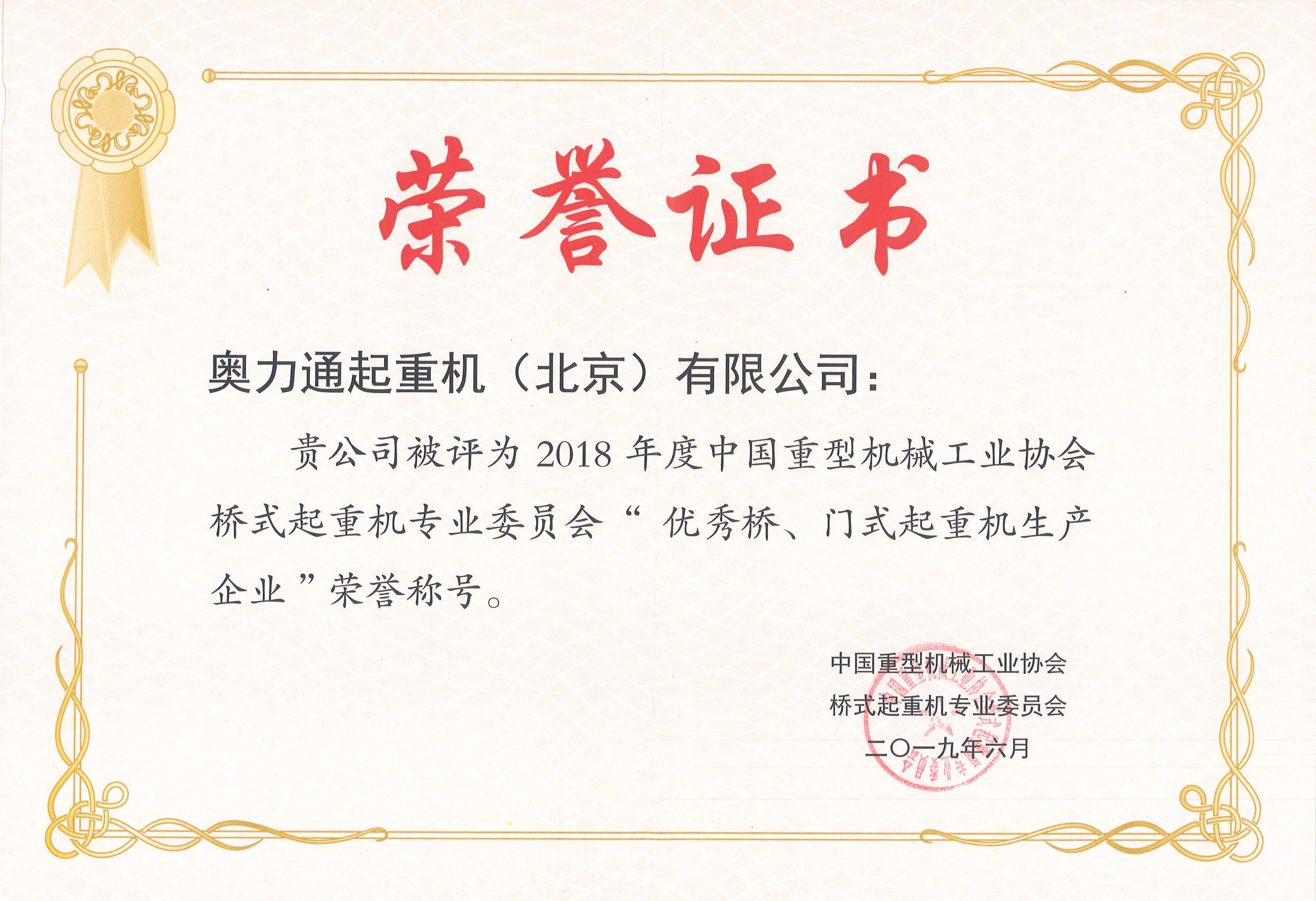 (YABO鸭脖荣获2018年度“优秀桥、门式起重机生产企业”)