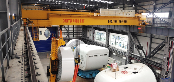 近日,我国清洁能源捷报频传,继10兆瓦风电机组成功下线不久后,13兆瓦亚洲单机容量最大风电机组于今年2月22日在福建三峡海上风电产业园成功下线。这不仅带动了我国风电全产业链升级,引领我国海上风电再获新突破,同时也促进大型国产吊装设备、安装运维等发展。YABO鸭脖起重机有幸参与东方风电13兆风电机组生产线大吨位双梁桥式起重机的设计、生产、安装、维护等项目建设,分别交付360t双小车起重机2台、150t起重机2台、125t起重机3台、100t起重机1台和32t起重机1台,用于10MW和13MW系列海上风力发电机组电机和整机装配。
