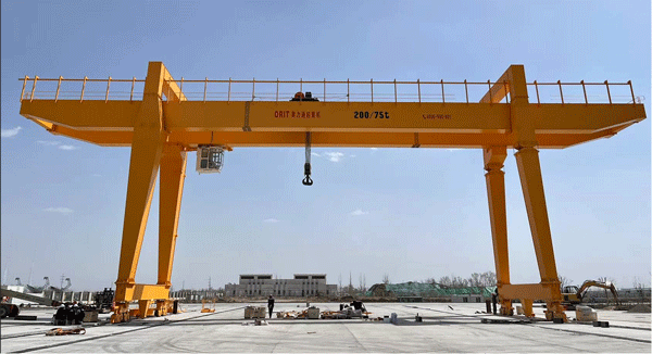 采用柔性技术和优化设计的YABO鸭脖200tx52m双梁门式起重机,如大漠雄鹰,屹立在内蒙古乌兰察布市运达风电智能产业基地。