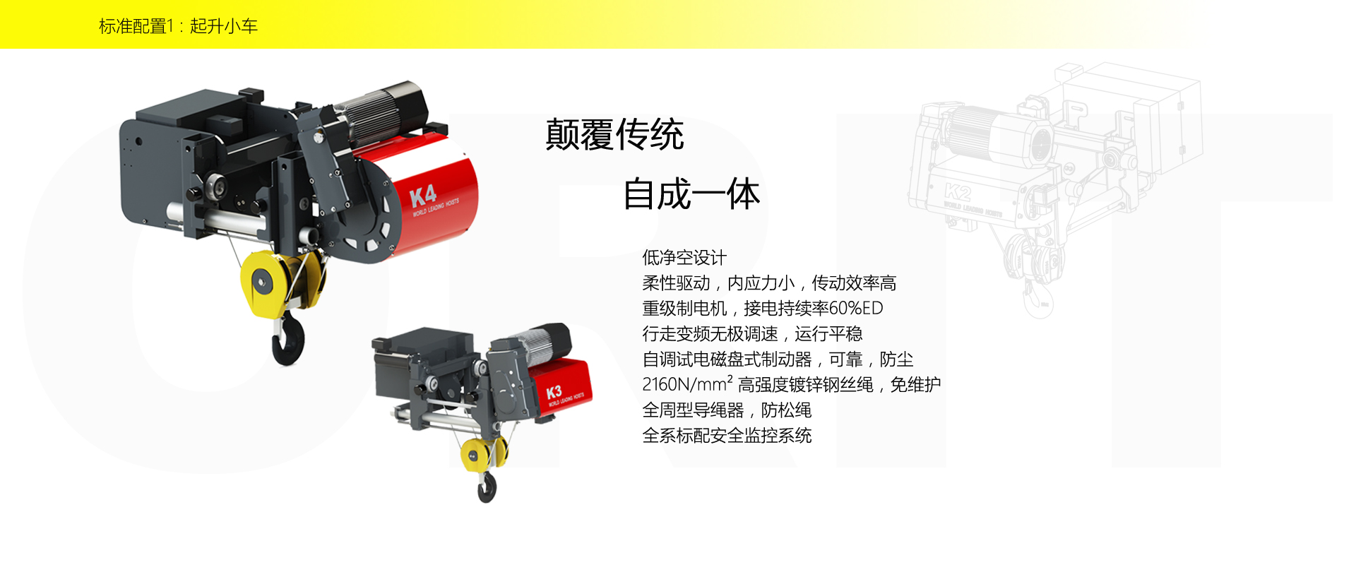 产品名称:半门式起重机 优化设计,结构紧凑 变频控制,运行平稳 实时安全监控,确保吊运安全 龙门吊专用C型驱动,节约空间 平轨设计,地面无障碍 美观大方,视野开阔,便于物流 标准化配置,让性能无比稳定 适用于12.5t以下额定载荷 标准配置1:起升机构 颠覆传统,自成一体 低净空设计 柔性驱动,内应力小,传动效率高 重级制电机,接电持续率60%ED 行走变频无极调速,运行平稳 自调试电磁盘式制动器,可靠,防尘 2160N/mm² 高强度镀锌钢丝绳,免维护 全周型导绳器,防松绳 全系标配安全监控系统 标准配置2:三合一驱动 静音科技,静享搬运 结构紧凑,铝合金壳体,密封 变频电机+硬齿面减速箱+盘式制动器 龙门专用C型三合一集成化设计,节约空间 全变频调速 最高转速4800 r/min 防护等级IP55 半油脂润滑,免维护 静音科技,静享搬运 标准配置3:电控系统 安全随心掌控 智能安全监控器 计算起升机构剩余安全工作时间 累计起升工作时间 累计超载次数 累计起升电机启动次数 起升电机过热保护及报警 刹车片厚度报警 ... ... 远程通讯 施耐德电气元件 航空插座接口 IP55防护等级 标准配置4:端梁 多变灵活,适应自如 模块化直驱设计 自重轻、体积小 多种连接方式,安装尺寸灵活 适用各种厂房,降低厂房高度 QT700车轮,自润滑,更静音 采用调心轴承,适应更自如 独特的平轨设计,地面无死角,物流无障碍 平轨半门式起重机,工业设计的匠心所在